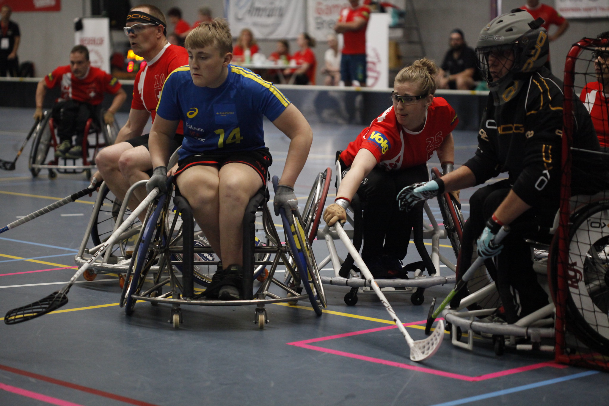 Wheelchair floorball began in the late 1990s when RC Thurgau (Wheelchair Club Thurgau) was founded. Floorball was back then and is still largely played in polysporting gymnastics. Floorball is still a secondary sport in Switzerland. There are 2 to 4 national fun tournaments a year. Disabled and non-disabled people from various swiss wheelchair clubs play there. We play on the small field, with 3 players. There is no national championship. That’s why Floorball is also not run by the Swiss Paraplegic Association as an official sport with support.
